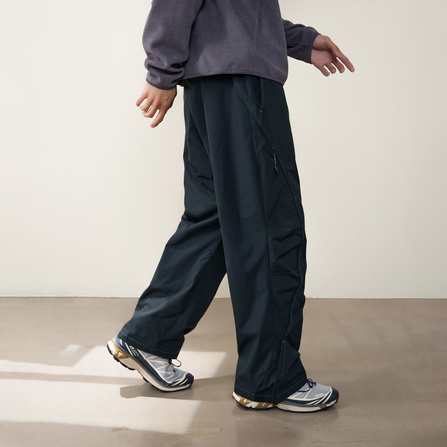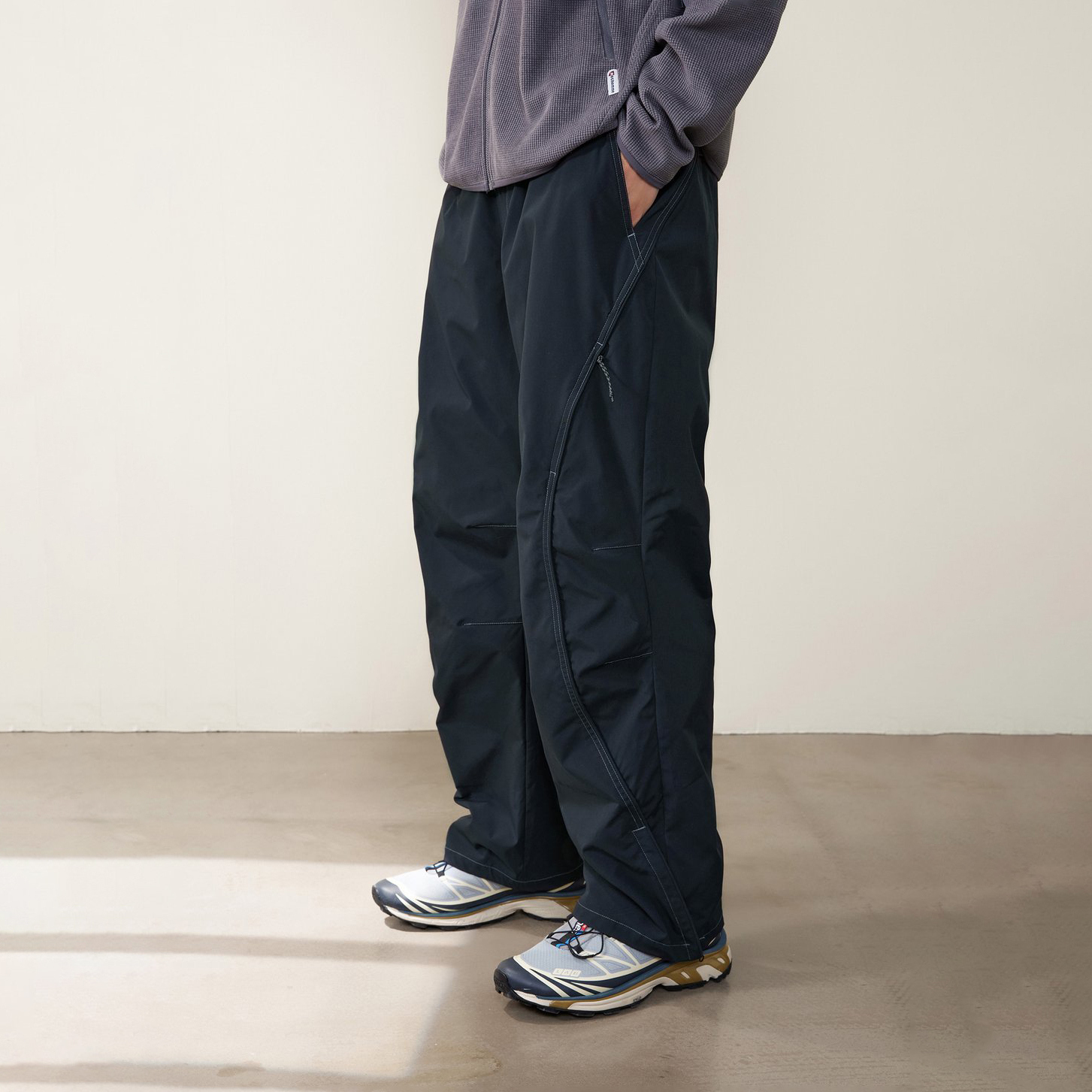 Брюки из легкого нейлона в Outdoor стиле дополнены сетчатой подкладкой. Сложный крой, анатомические линии и акцент на деталях. Шесть карманов: два боковых, два сзади на молнии и два скрытых на молнии в швах. Регулировка пояса с помощью шнура и внизу брюк молния для создания дополнительного объема. Защитная пропитка Teflon добавляет ткани водоотталкивающую способность.