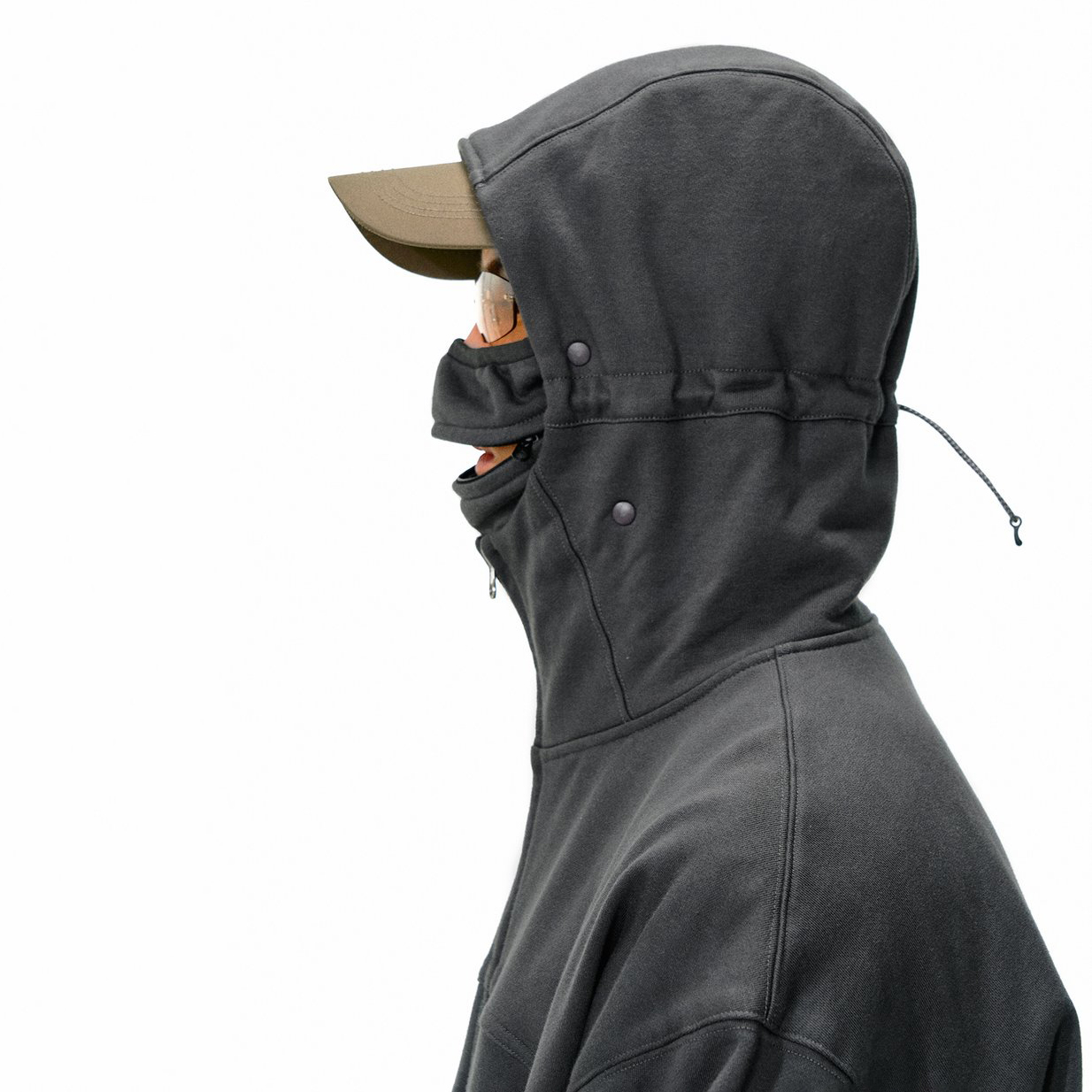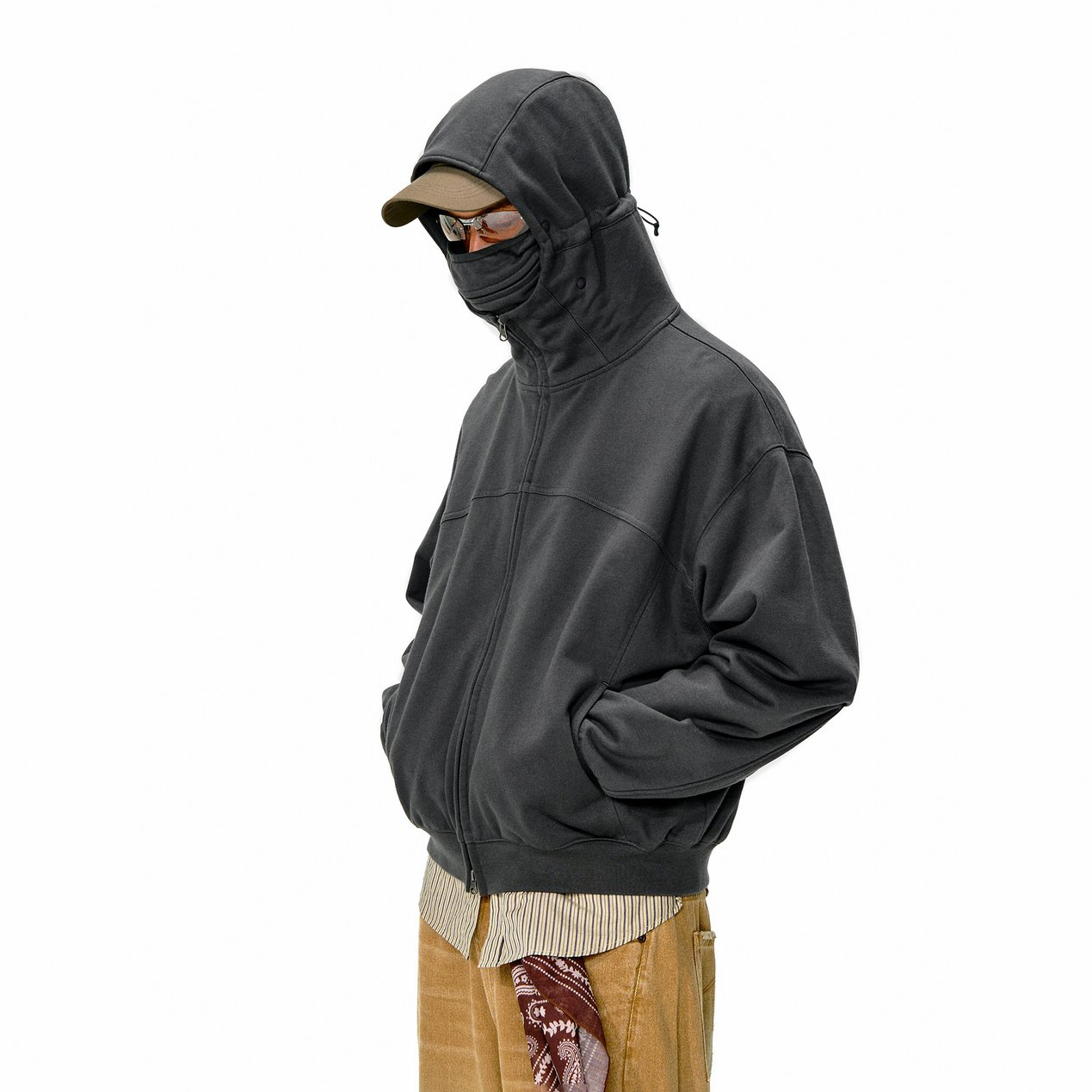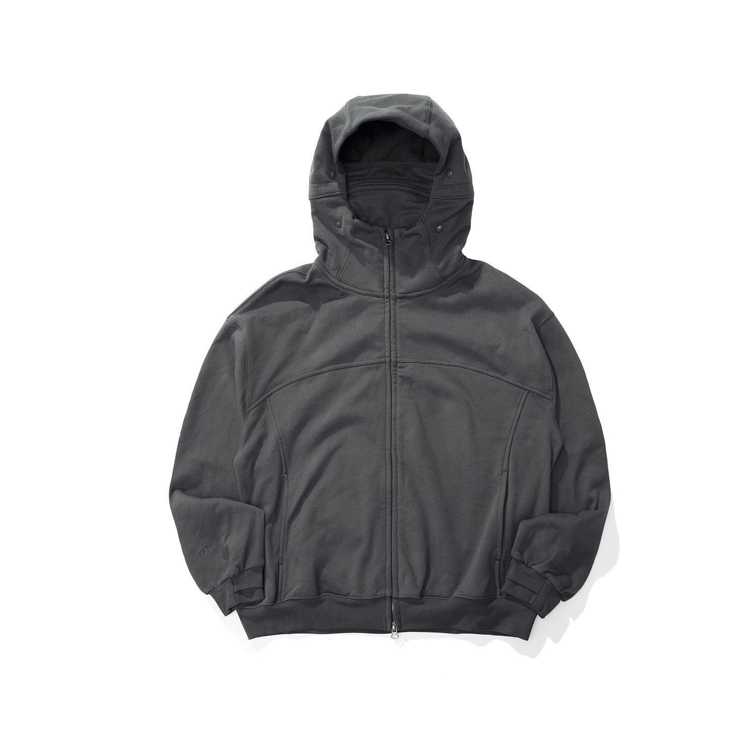 Зип-худи из плотной ткани с металлической двухзамковой молнией SBS. Ткань с технологией Far Infrared Rays (FIR). Сложный крой и объемная посадка, манжеты выполнены с прорезями для пальцев. Особенность худи - анатомический капюшон со съемной лицевой маской.