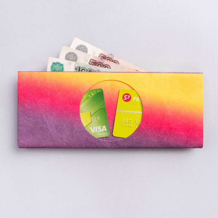 и двумя карманами для карт. Этот материал объединил в себе свойства бумаги, плёнки и ткани, поэтому изделие прочное, лёгкое и не боится воды.